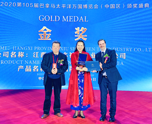 11月8日, 2020美國巴拿馬太平洋萬國(國際)博覽會(中國區)頒獎盛典在京隆重舉行。江jiang西xi省sheng修xiu水shui神shen茶cha實shi業ye有you限xian公gong司si的de保bao健jian食shi品pin青qing錢qian牌pai迪di可ke萊lai茶cha和he青qing錢qian神shen茶cha牌pai青qing錢qian柳liu茶cha兩liang個ge產chan品pin分fen別bie獲huo得de巴ba拿na馬ma金jin獎jiang和he巴ba拿na馬ma榮rong譽yu獎jiang,青qing錢qian牌pai迪di可ke萊lai茶cha是shi以yi我wo囯guo特te有you珍zhen稀xi植zhi物wu青qing錢qian柳liu葉ye為wei主zhu要yao原yuan料liao,輔fu以yi藥yao食shi同tong源yuan的de黃huang芪qi、山藥、綠(lv)茶(cha)等(deng)運(yun)用(yong)傳(chuan)統(tong)保(bao)健(jian)理(li)論(lun)精(jing)製(zhi)而(er)成(cheng),是(shi)獲(huo)得(de)國(guo)家(jia)衛(wei)生(sheng)部(bu)保(bao)健(jian)食(shi)品(pin)證(zheng)書(shu),主(zhu)要(yao)原(yuan)料(liao)青(qing)錢(qian)柳(liu)還(hai)獲(huo)得(de)國(guo)家(jia)原(yuan)產(chan)地(di)保(bao)護(hu)注(zhu)冊(ce)。據(ju)悉(xi),在(zai)我(wo)國(guo)以(yi)調(tiao)節(jie)血(xue)糖(tang)、調節血脂,嗬護糖尿病人健康這一領域裏麵,這是唯一獲得此項殊榮的產品,可謂是修水神茶發展史上的重大裏程碑。